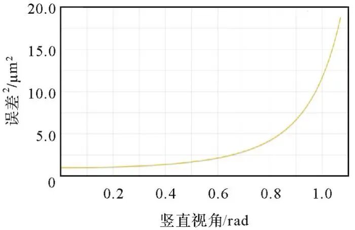 图2为竖直视角βl对点位精度的影响函数曲线,竖直视角βl在0~0.2 rad时,即βl∈[0°,11.5°]时,测量点误差较小;竖直视角βl在0.2~0.4 rad时,即βl∈[11.5°,23.0°]时,测量点误差缓慢增高;当竖直视角βl超过0.4 rad时,即βl≥23.0°时,测量点误差逐渐变大。整体来看,当βl∈[0°,23°]时,测量点误差较小,可靠性较高。