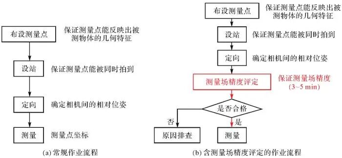 根据双相机系统测量原理,被测物体上同一物点只有同时被两台相机拍摄到,系统才能测量出其空间三维坐标。因此,现场作业过程中,首先要根据被测物体的尺寸和状态布设双相机系统,保证各测量点能够被两台相机同时拍到;其次,对系统进行定向,解算两台相机在现场条件下相对的位置和姿态。定向完成后即可对被测物体进行测量,常规作业流程如图6(a)所示。