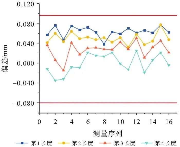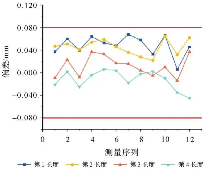 MPS/M20系统标称精度为0.040 mm(<4 m, 1σ),若按照2σ计算,则该设备在4 m测量范围内的精度为0.080 mm。根据第1种方法的试验结果,设备的测量精度可以满足要求;而根据第2种方法的试验结果,有约30%的长度偏差值超过了0.080 mm,设备的测量精度不满足精度要求。