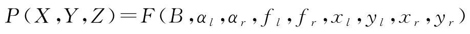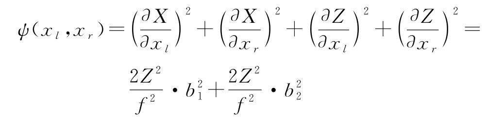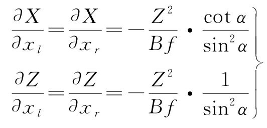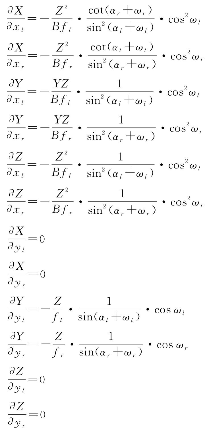 由式(1)可知,物方点坐标的精度受到视场角、相机光轴与基线夹角、基线长度等多种因素影响。物方点坐标的函数模型可记为