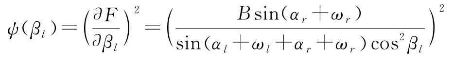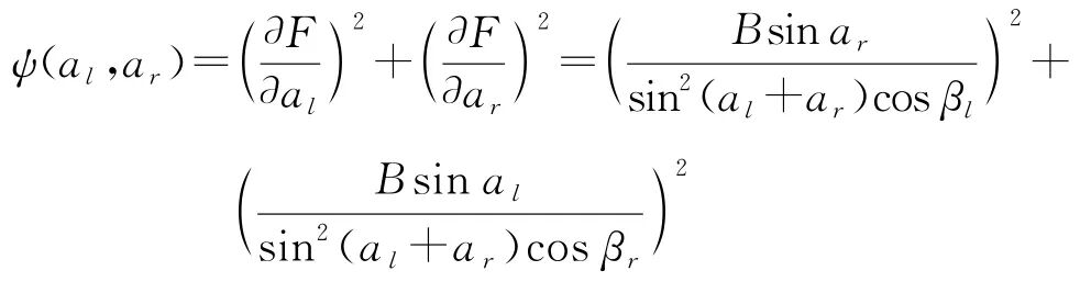 采用软件仿真发现,在βl=βr条件下,al和ar在0.5~1.2 rad时,即al、ar∈[28°,68°]时,测量点误差较小;当αl和αr超过上述范围时,测量点误差将快速上升(图4)。