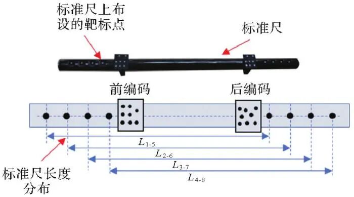 通过第1节理论分析,由图2—图5可知,双相机测量场范围内,βl、βr∈[-23°,23°],al、ar∈[28°,68°],Z∈[0.4B,1.3B]时,测量结果的可靠性较高。为保证系统现场作业质量和作业效率,本文提出一种现场条件下采用高精度摄影测量标准尺快速评定系统测量场精度的方法。对于特殊测量场景,如仅对测量场范围内2个点进行测量,也可在本文方法的基础上对测量场某一部分进行测量评价,提高作业效率。为表述方便,以下简称“第1种方法”,该双相机系统含测量场精度评定的作业流程如图6(b)所示。