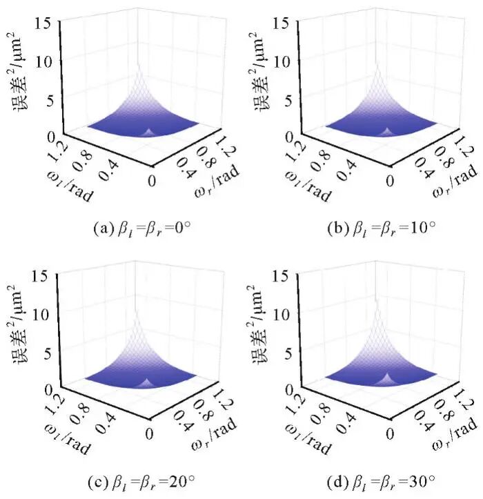 由于双相机系统竖直视角范围较小,当βl=βr,且分别为0°、10°、20°、30°时,对测量点与基线水平夹角对点位误差的影响进行研究。