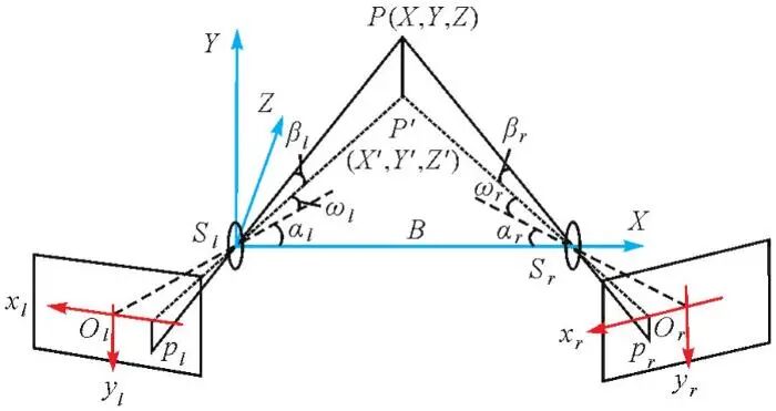 双相机系统测量空间点如图1所示,设左相机像空间坐标系Sl-xlylzl,像平面坐标系为ol-xlyl,主距为fl;右相机像空间坐标系Sr-xryrzr,像平面坐标系为or-xryr,主距为fr。为方便讨论,物方坐标系Sl-XYZ采用左手坐标系,其他坐标系均采用右手坐标系。设物方点P在Sl-XYZ中的坐标为(X,Y,Z),左像片中对应的像点pl在其像空间坐标系中的坐标为(xl,yl,fl),P在右像片中对应的像点pr在其像空间坐标系中的坐标为(xr,yr,fr)。OlSl和OrSr是左右两台相机的光轴方向,βl和βr分别为竖直方向视场夹角,ωl和ωr分别为水平方向视场夹角,αl和αr分别为相机光轴与基线的夹角,B为两台相机基线之间的长度[39]。