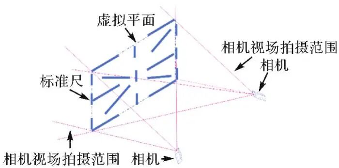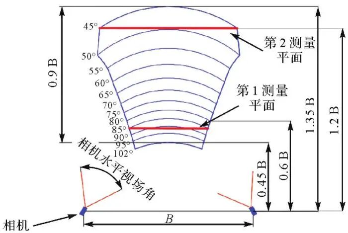 具体方案为采用定向完成的双相机系统对测量场内19个位置的摄影测量标准尺进行测量,要求摄影测量标准尺精度比双相机系统的标称精度高3倍以上,如图7所示。标准尺位置分布在两个测量平面上,第1测量平面位于测量场纵深方向距双相机基线0.4B~0.6B位置处,该平面内竖向放置标准尺,从左至右共3列,每列分别在上、中、下3个位置进行测量,共摆放9个位置;第2测量平面与第一测量平面平行,距基线1.1B~1.2B,该平面内标准尺横向放置6个位置,斜向45°放置4个位置,共放置10个位置(也可根据视场大小增加横向标准尺摆放的位置)。测量过程中要求标准尺摆放的位置尽可能覆盖整个测量场边界,且标准尺靶标点与双相机交会角不小于45°,竖直视角不超过23°,相机光轴与基线的夹角介于28°~68°。测量完成后,比较标准尺标称值与实测值之间的差异,结合双相机系统的精度指标,对测量场精度进行评定。该方法确定的测量场范围如图8所示。