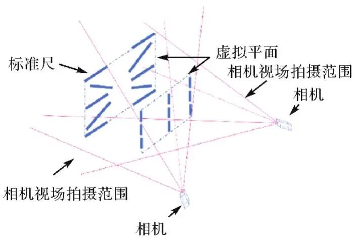 实践中,受到相机布设形式、摄影距离等因素影响,不同应用场景下双相机系统测量精度有所不同,实测数据精度低于系统标称精度的情况时有发生,影响设备的有效使用。遗憾的是,目前国内外还没有针对双相机系统的校准规范,厂家交付产品时一般只能提供企业内部或国家计量机构出具的精度测试报告,其精度一直以来都是业内关注的焦点。文献[36]从系统相机标定、特征提取等方面进行研究,提出了测试系统精度的方法,对双相机系统的应用具有较好的借鉴意义。文献[37-38]基于试验探索,从摄影距离、交会角、相机温度等方面对双相机系统进行了研究,取得了一些实用性较强的研究成果,但其成果未与双相机系统的测量原理进行耦合,推广价值有限。文献[39-40]构建了基于双相机的空间前方交会模型,对双相机网形结构参数进行误差分析与试验验证,对双相机误差理论的完善和应用具有积极意义,但未形成实用的现场测量方法。如何在作业现场快速、准确评定双相机系统测量场精度,保证系统在精度可靠的前提下开展工作已成为现阶段亟须解决的问题。