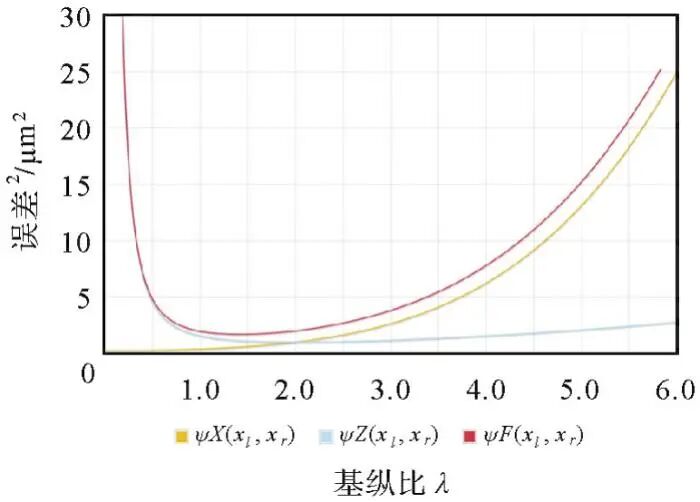 基纵比对点位精度趋势如图5所示,当基纵比λ∈[0.8,2.5]时,测量点误差较小,当λ=1.4时,测量点误差最小。也就是说,采用双相机系统进行测量时,应当将被测物体放置在[0.4B,1.3B]的纵深范围内,当超过该范围后,测量点位的误差将快速增加。