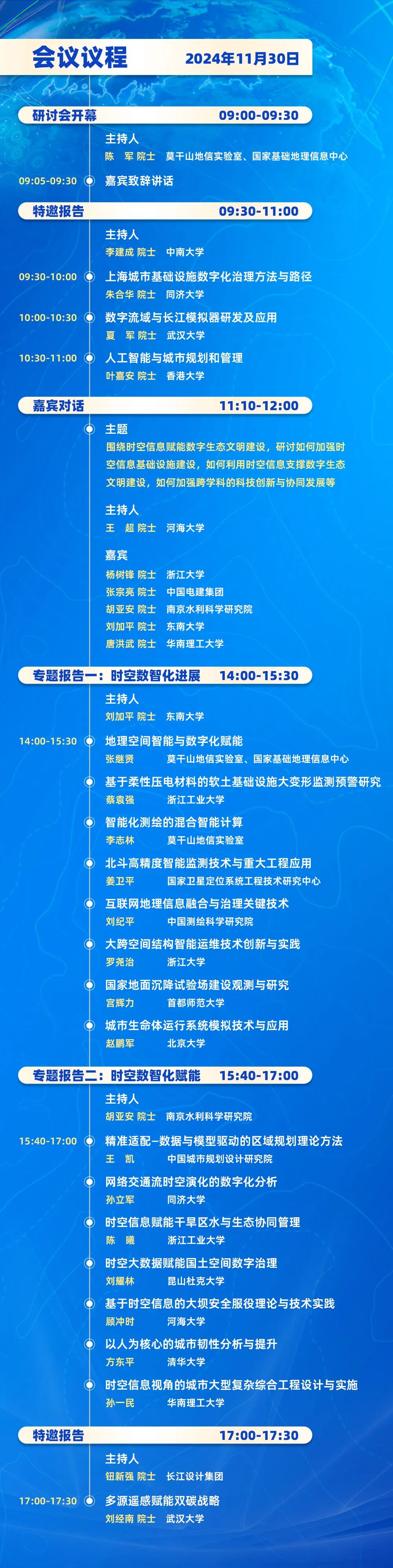 11月30日,“时空信息赋能数字生态文明建设”学术研讨会将在浙江省湖州市德清县举办,本次研讨会分为开幕式、特邀报告、嘉宾对话、专题报告等7个环节,14位院士、200余名专家学者将齐聚一堂,围绕时空数智化进展、时空数字化赋能等专题展开深入研讨,分享新成果新经验,探寻新路径新趋势,推动面向数字生态文明的跨界融合与协同创新。