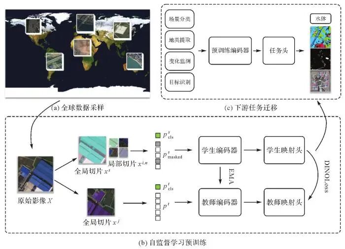 在人工智能、AI大模型发展环境下,面向基础地理信息更新、自然资源调查监测、全球地表覆盖变化等应用需求,本文实现了“无标签数据集构建-自监督模型学习-下游迁移应用”遥感大模型构建思路。首先,在全球范围采样随机点,收集大规模无标签遥感数据,覆盖城市、农田、水域、森林、荒漠等地表覆盖类别;然后,利用自监督学习方法,让模型在没有人工标签的情况下自我学习和理解这些数据的内在结构和模式,形成遥感大模型;最后,进行模型微调,迁移至地类提取、变化检测、目标识别等下游任务。