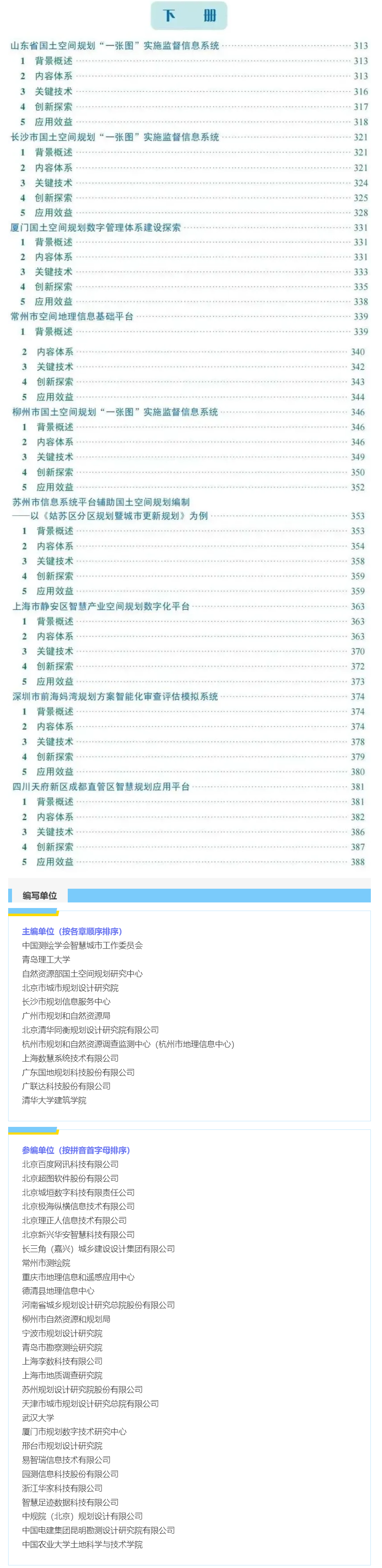 《智慧国土空间规划应用与发展》由中国测绘学会智慧城市工委会联合清华大学建筑学院、武汉大学、青岛理工大学、自然资源部国土空间规划研究中心、北京市城市规划设计研究院、长沙市规划信息服务中心、广州市规划和自然资源局、北京清华同衡规划设计研究院有限公司、上海数慧系统技术有限公司、广东国地规划科技股份有限公司、广联达科技股份有限公司等40家单位共同编写。