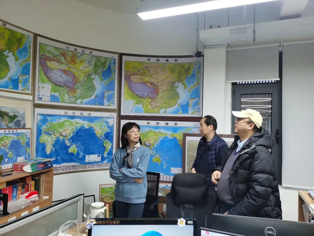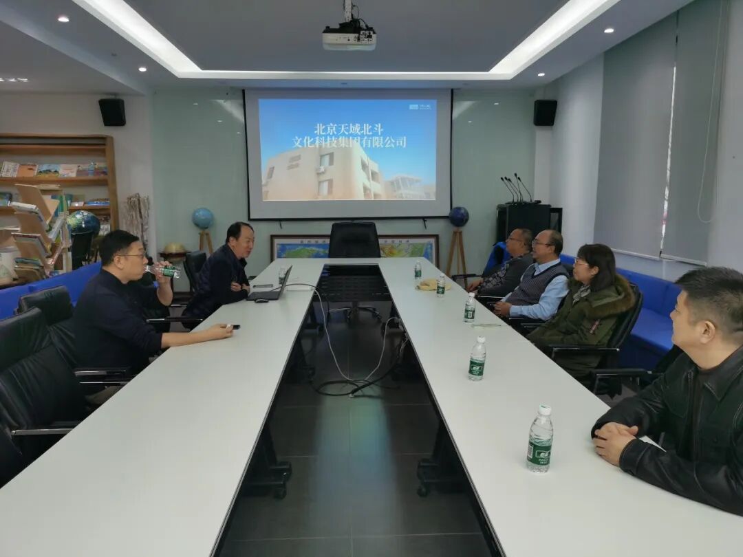 调研活动围绕座谈交流、现场观摩、实地学习三大环节有序开展。座谈中,朱伟总裁详细介绍了北京天域北斗集团的发展历程、核心业务及技术优势。该集团成立于1999年,注册资金3500万元,现有员工200余人。集团以 VR、AR技术为引领,深耕教育、文化、科技领域,形成集研发、生产、销售于一体的综合发展模式,产品涵盖图书期刊、科技地球仪、多媒体教学设备、地理信息产品等,尤其在数字融合、沉浸式地理教学等领域率先探索,成果显著。座谈交流环节,双方就地理信息产业创新发展、技术成果转化、跨区域资源共享等议题深入探讨,交换意见。