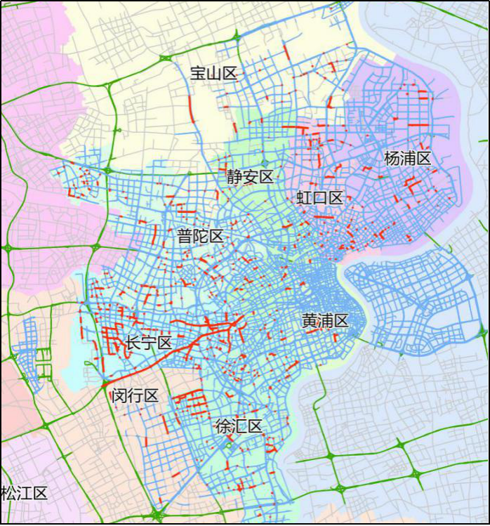 上海市中心城区2016-2018年管线数据维护示意图(红色线条为更新数据)
