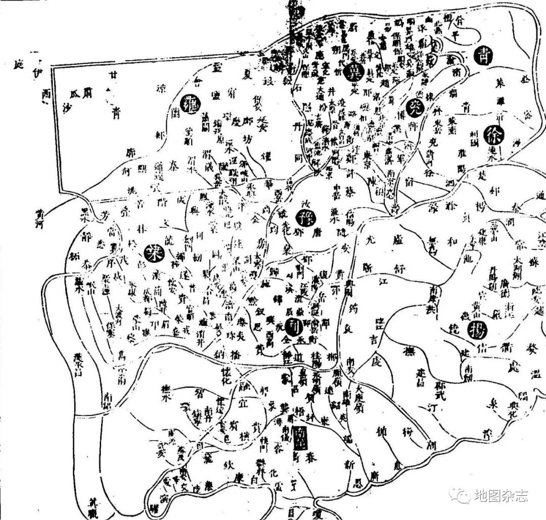 第三类,对第二类地图的进一步简化。这一类只有《帝王经世图谱》“禹迹九州之图”一幅,图中去掉了所有河流和水体,但将河流的名称都保留了下来。