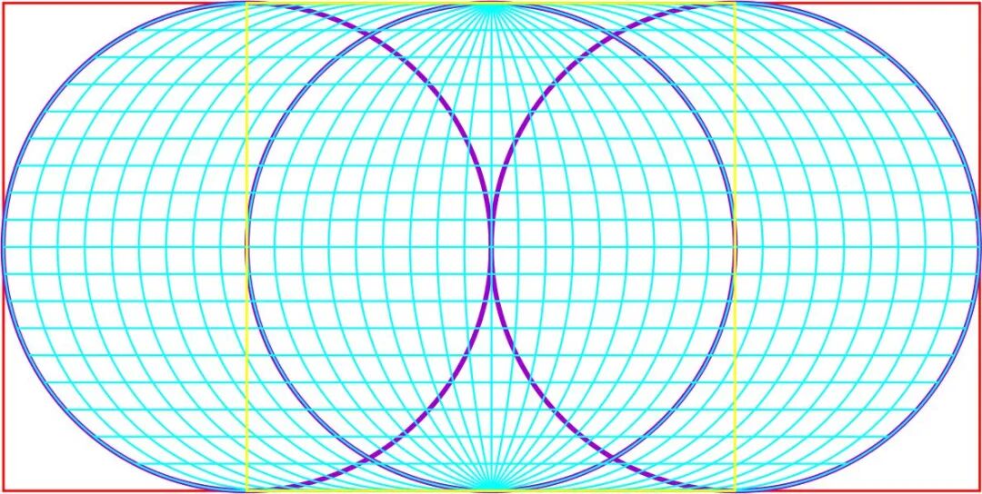 ▲椭圆投影(oval projection)经纬网性质示意(其中黄色矩形为正方形)