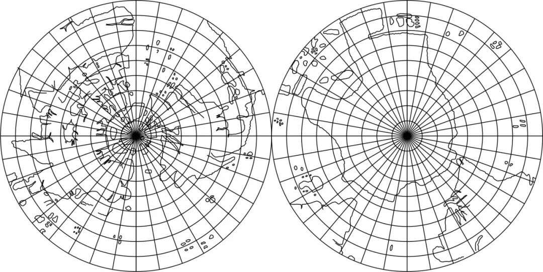 ▲数字恢复的《坤舆万国全图》北半球和南半球附图