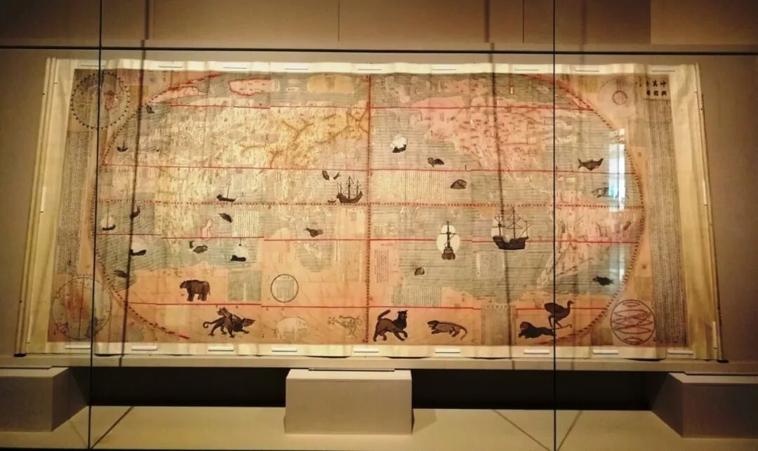 ▲2019年浙江美术馆“心相·万象——大航海时代的浙江精神”特展上亮相的《坤舆万国全图》彩色摹绘本(南京博物院藏,作者摄)