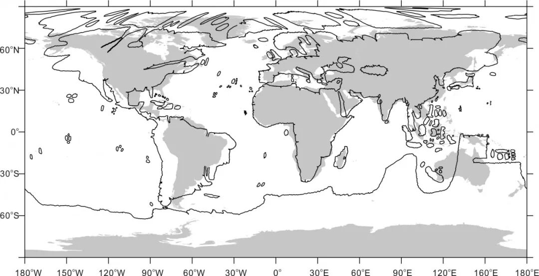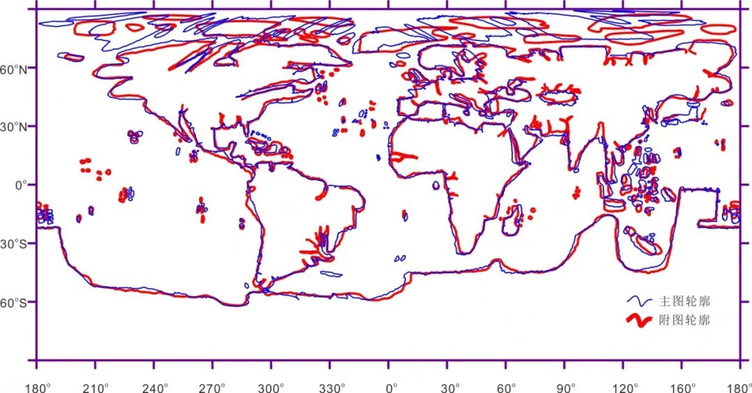 将《坤舆万国全图》地图主图同实际海陆轮廓进行对比,可整体把握当时对世界地理的描绘精度。