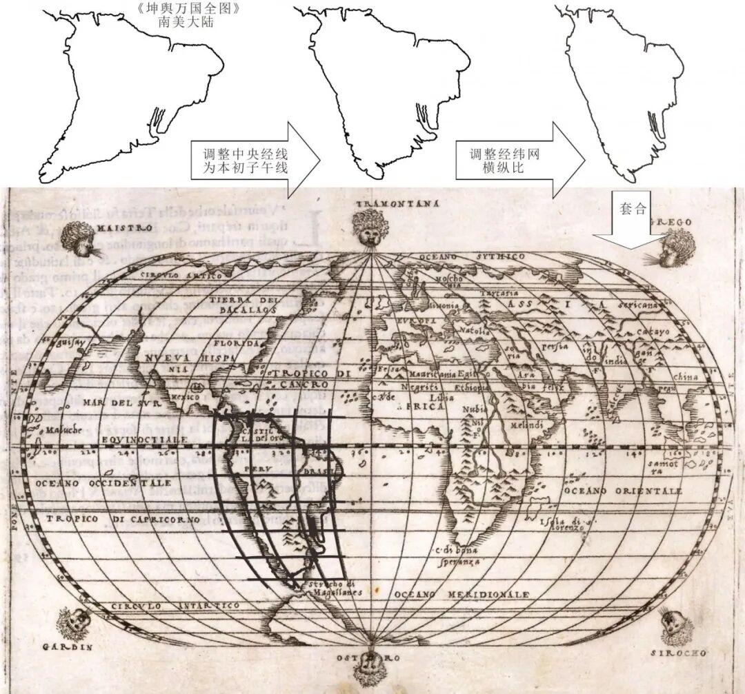 Gastaldi世界地图可能也是《坤舆万国全图》的参考资料之一。通过调整《坤舆万国全图》的中央经线,将其本初子午线设为中央经线,同时调整南美大陆部分的横纵比,使之同Gastaldi世界地图的经纬网重合。