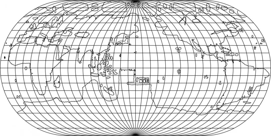 椭圆投影(oval projection)除中央经线为直线外,其余经线均为沿赤道等间隔分布的对称弧线(当经度超过半球时,弧线为半圆),中央经线长度无变形;椭圆投影的纬线为等间隔平行线,赤道上长度无变形;椭圆投影的两极收敛于直线,其长度为赤道长度的一半。