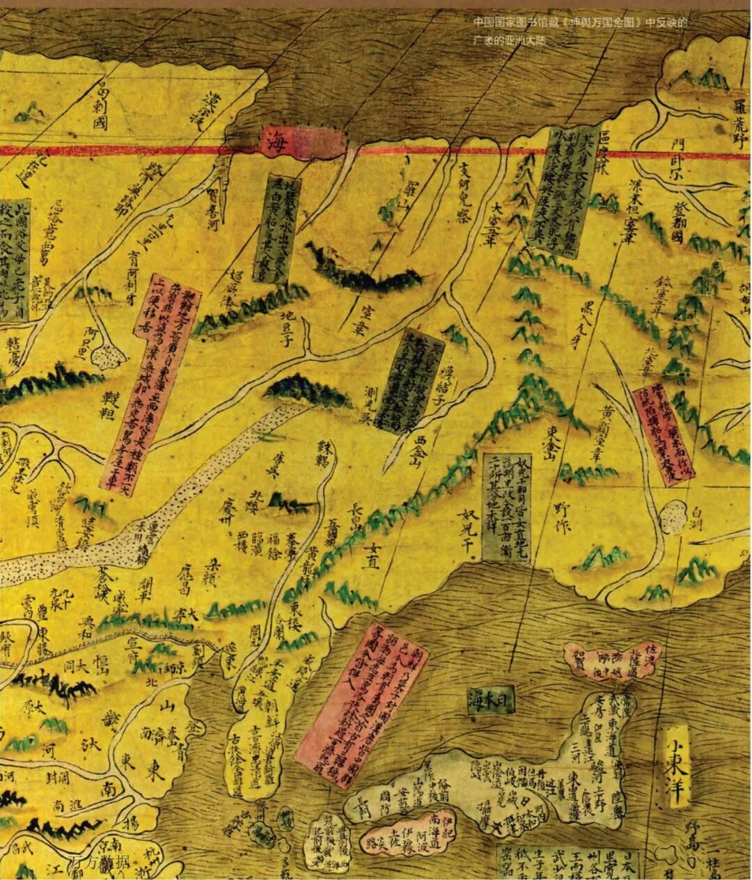 南美大陆西侧还注有“南北亚墨利加并墨瓦蜡泥加,自古无人知有此处,惟一百年前欧逻巴人乘船至其海边之地方知……”,哥伦布1492年发现新大陆,按此推算这段话成于1592年左右。