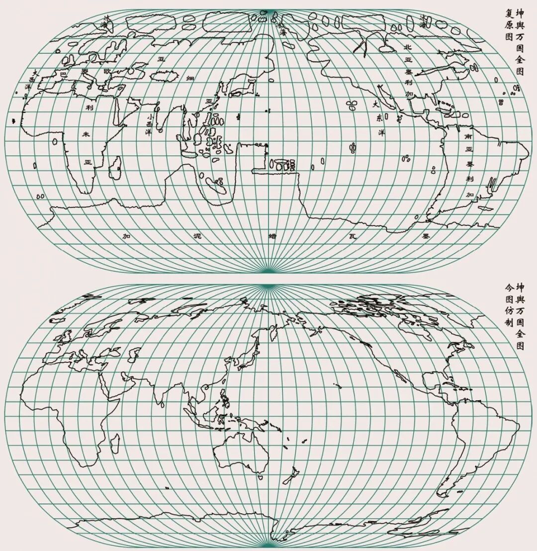 ▲《坤舆万国全图》同现代海陆轮廓对比