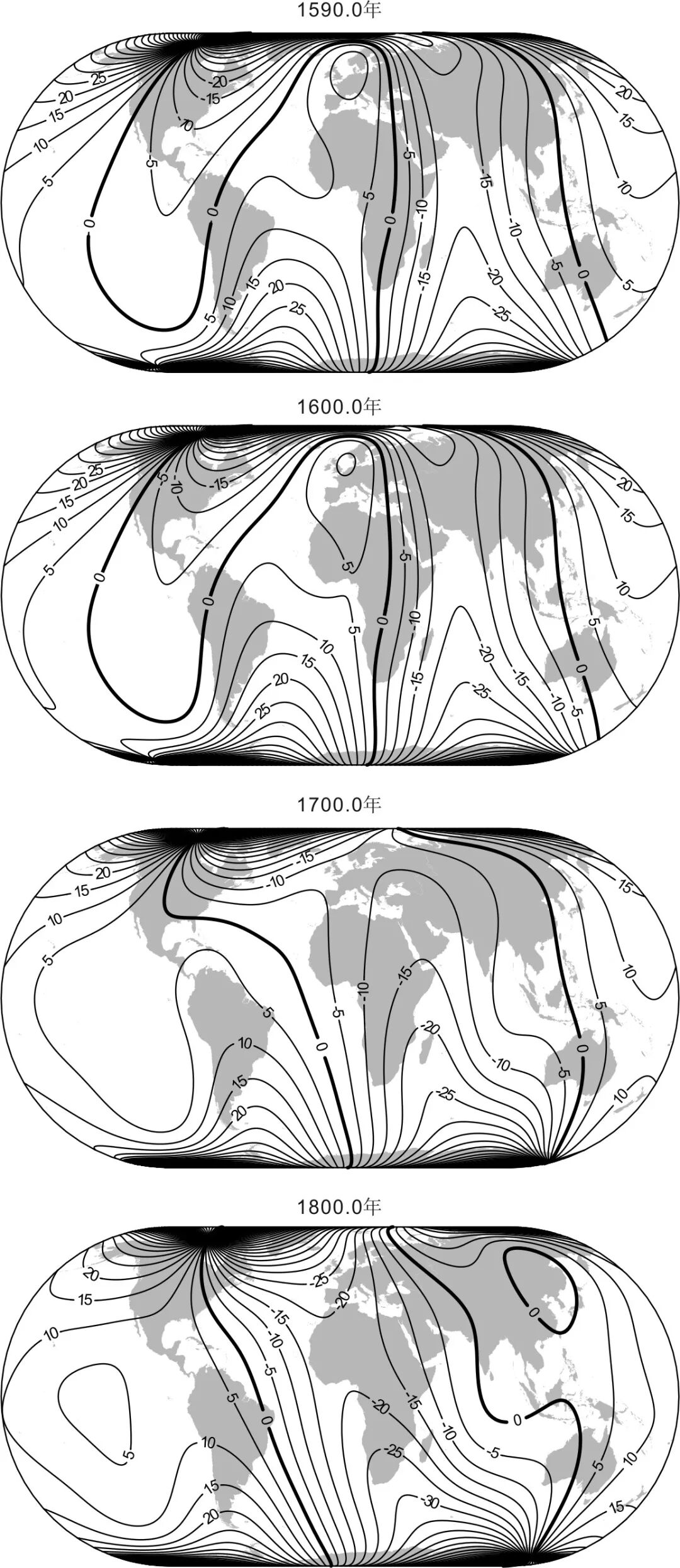 上图GUFM模型计算的1590.0年、1600.0年、1700.0年及1800.0年全球磁偏角表明自1590年以来地磁场存在显著的西向漂移特征,过非洲罗经正峰处的地磁场零偏线自1590年起一直西漂,100年后漂至大西洋,200年后则漂至美洲,其中1700.0年大西洋地磁场零偏线特征在哈雷的图上也有清晰反映。全球地磁场平均每年西漂约0.2°,只有利玛窦时代“罗经正峰”(非洲南端厄加勒斯角附近)磁偏角才应该为零(接近零)。