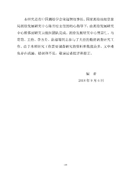 本研究是在中国测绘学会宋超智理事长、国家测绘地理信息 局测绘发展研究中心陈常松主任的精心指导下,由测绘发展研究 中心熊伟副研究员组织团队完成。测绘发展研究中心贾宗仁、马 萌萌、王维、李方舟、薛超等同志参与了大量的数据调查研究工 作。由于本项研究工作需要调查研究的资料和数据众多,文中难 免存在疏漏、错误和不足,敬请读者批评和指正。 编 者 2018 年 9 月 6 日 122