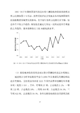 图 1-9 2001-2017 年国家科技进步奖中测绘地理信息类获奖项目数量占比情况