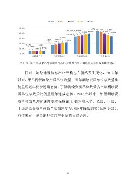 图 1-30 2013 年以来各等级测绘资质单位数量占当年测绘资质单位数量比例情况 同时,测绘地理信息产业结构也在悄然发生变化,2013 年 以来,甲乙丙级测绘资质单位数量占当年测绘资质单位总数量比 例呈现逐年稳步递增态势,丁级测绘资质单位数量占当年测绘资 质单位总数量比例呈逐年递减态势。2015 年以来,甲级测绘资 质单位数量增加速度基本保持在 9.4%左右水平,乙级、丙级、 丁级测绘资质单位数量增加速度呈现逐年降低态势(见图 1-31)。 总体来看,测绘地理信息产业结构日趋合理。 66