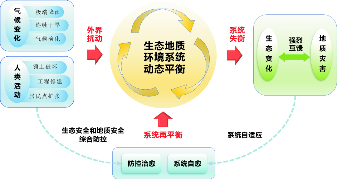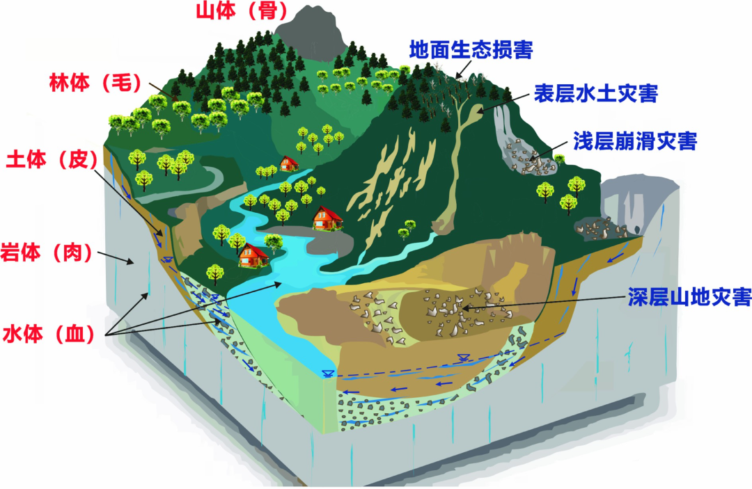 (1)明晰生态地质环境系统组成,探究生态地质环境要素相互作用机制。生态地质环境系统是生态环境系统、地质环境系统和灾害环境系统的综合,包括山体(骨)、岩体(肉)、土体(皮)、植被(毛)、水体(血)和气候(气)等生态地质环境要素。生态地质环境是一个复杂开放的体系,时时刻刻处于演化状态。当这种演化超出生态环境与地质环境的承受能力,必然会出现自然、人为和自然-人为的生态地质环境问题。为此,需要探究山体、岩体、土体、植被、水体和气候等之间的相互作用关系,阐明生态过程、水文过程、地质过程、灾害过程、气候演化过程、人类活动之间的互馈作用机制。