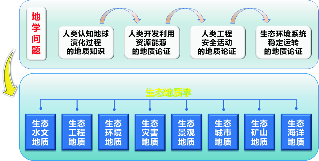 (4)完善生态地质学结构体系,培养更多复合型人才,服务国家重大战略和工程切实需求。国家经济的快速发展导致人-地相互作用愈加强烈,进而致使人类活动与生态环境和地质环境之间的制约关系日渐凸显。生态地质学应通过研究自然环境与人为扰动影响下生态作用、地质作用和灾害效应的时空转变,解决人类活动与生态环境和地质环境之间的制约难题。但目前生态地质学仍存在研究范围不具体、相关学科间存在脱节与成果表达不统一、生态环境深层致灾机理不明、生态响应规律不清与资源调控配置不合理等问题,难以为国家重大战略实施与行业发展提供切实可行的理论支撑与技术保障。为此,要不断完善生态地质学结构体系,积累更加系统性的生态地质学研究成果,培养更多复合型人才,服务国家重大战略和工程建设的切实需求。