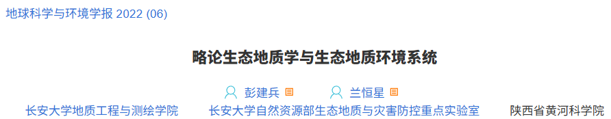 [1]彭建兵,兰恒星.略论生态地质学与生态地质环境系统[J].地球科学与环境学报,2022,44(06):877-893.DOI:10.19814/j.jese.2022.06006.