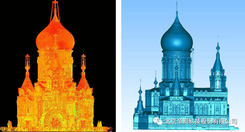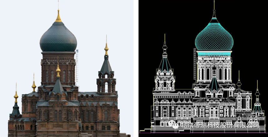 圣索菲亚教堂是三维立体的凿造,雕造结构十分复杂,简单的平面与立面测绘图件无法完整、真实地反映建筑的形态、结构及保存状况,系统、科学的调查与记录及相关保护修复工作难以进行。三维激光扫描结合近景摄影等技术留取索菲亚教堂翔实历史信息,为维修设计提供精准尺寸与重要基础图件。